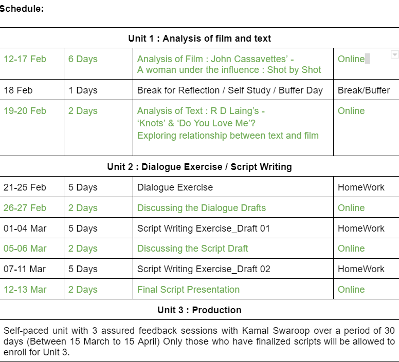 Participants may enroll in unit 1 i.e Analysis unit alone or unit 1&2 both – Analysis and Dialogue Exercise. Enrolment in unit 3 is subject to successful completion of Unit 2 i.e only those with a final script ready will be mentored through the production of short film.