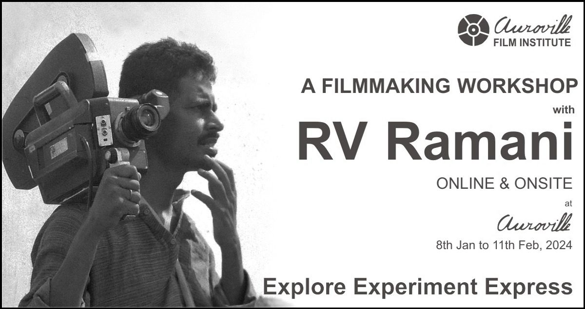 3E-Explore, Experiment, ExpressA 5- weeks filmmaking workshopWith R V Ramani ONLINE – ONSITE BLENDED MODALITY SCHEDULE 108th to 10th January 2024 – Online – 10am to 1pm – Interactions, Film Exercises, Reviews11th to 17th January 2024 – Research, Film Exercises, Travel (Participants reach Auroville by 17th Jan) SCHEDULE 2Residential Workshop in Auroville (2 weeks)18th to … Continue reading 3E – Explore, Experiment, Express